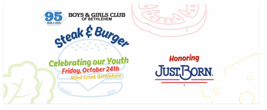 The Boys & Girls Club of Bethlehem will host its annual Steak & Burger Dinner on Friday, October 24, 2025, at Wind Creek Bethlehem. The evening begins with a cocktail hour at 5:30 p.m., followed by dinner and a program at 6:30 p.m., celebrating 95 years of service to local youth.