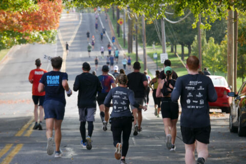 We were able to grab some pictures of the Half Marathon around mile 11 or so where the Run and Brew running group was set up giving out beer and …. FIREBALL … shots to runners as they were making their final few miles back to SteelStacks.
