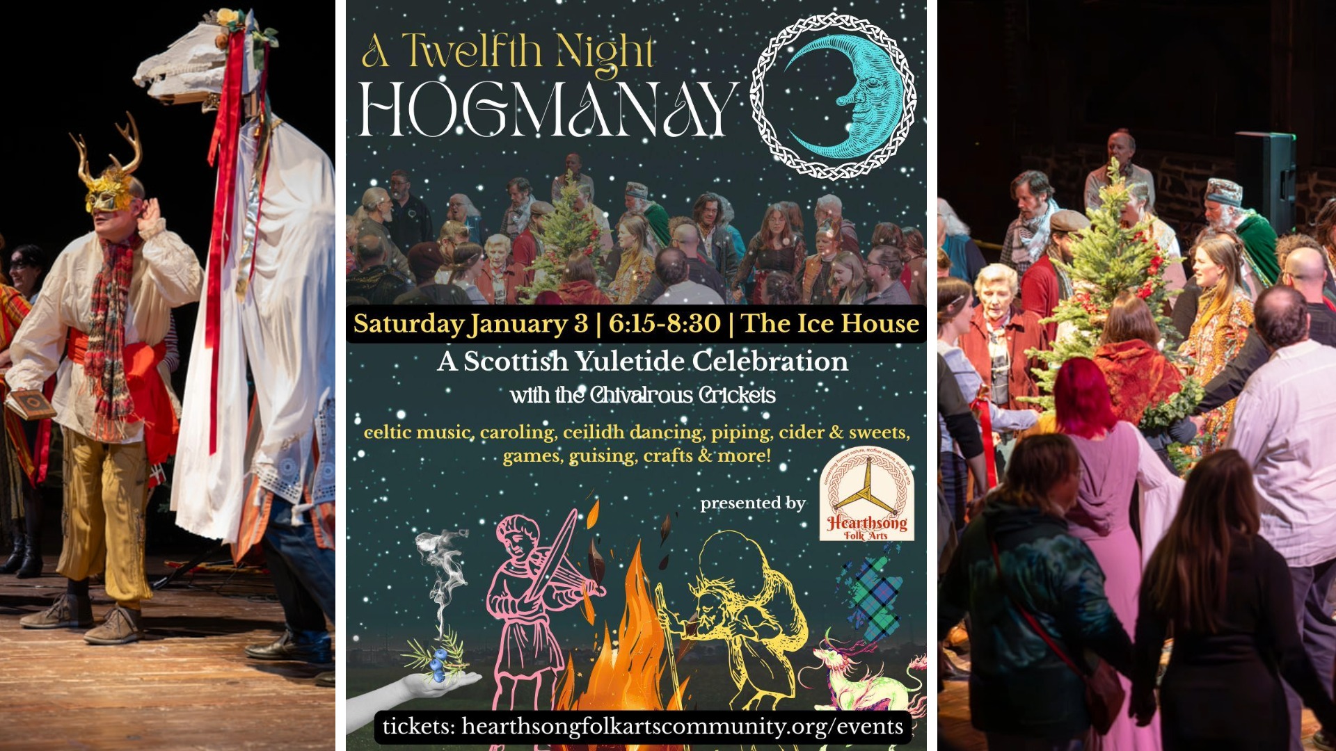 Billed as part show, part festival, and part community party, the event blends old-world Yuletide customs with Scottish New Year traditions. Attendees can expect a lively mix of Celtic music, a piping processional, caroling, and ceilidh dancing (watch or join), along with a “guising” play inspired by traditional mummers performances, complete with comedic sword-fighting.