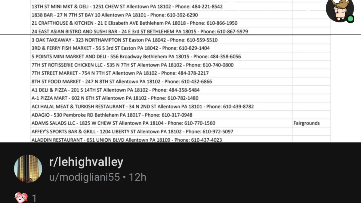 My wife and I moved to the Lehigh Valley for work mid-pandemic – and this is to be our forever (or foreseeably forever home). So proposed that we attempt to eat at/from every restaurant in the three big cities (Allentown, Bethlehem, Easton). We’ve been keeping track for the past few years but thanks to posters here on Reddit, I finally put together a list from the state health board that makes it seem doable. Around 650 restaurants/food establishments – we’ve done a little over 100 so far. Thought l’d share in case anyone wants to join in. – Reddit