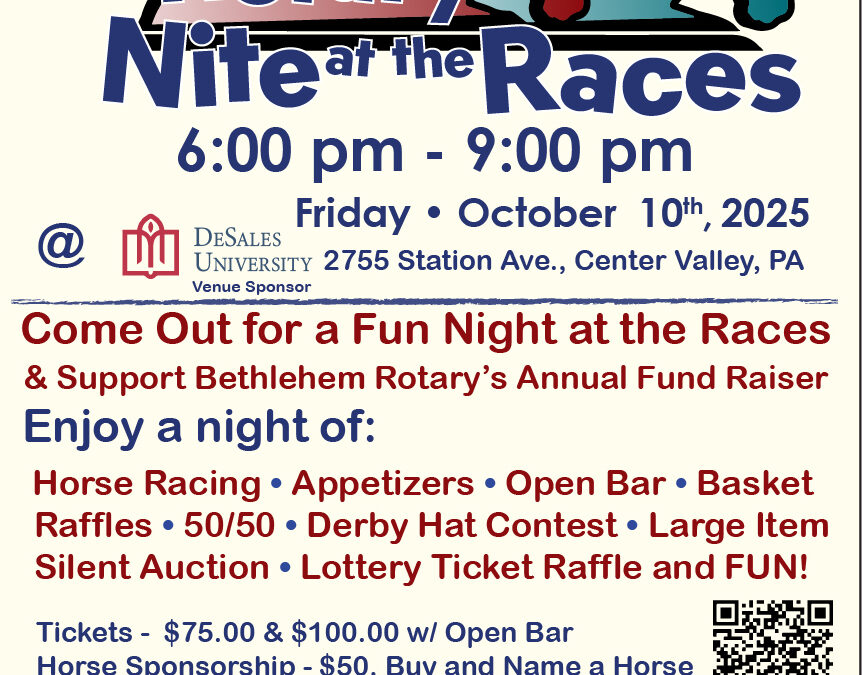 Tickets, sponsorships, and horse naming can be arranged through the Bethlehem Rotary Club’s event page. For sponsorships or donations, contact Dana Huber at 610-866-8013 ext. 119. Raffle baskets and auction items will be accepted through October 6, 2025.