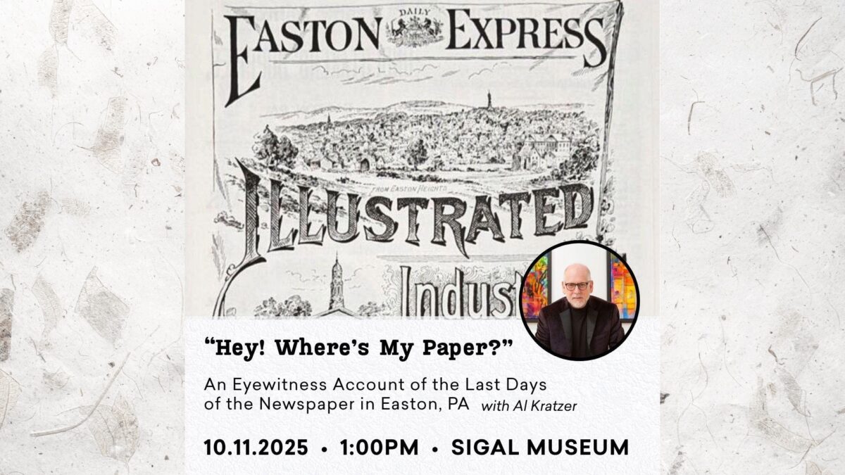The Sigal Museum in Easton will host publisher and cartoonist Al Kratzer on Saturday, October 11, 2025, at 1 p.m. for a program titled “Hey! Where’s My Paper? An Eyewitness Account of the Last Days of the Newspaper in Easton, PA.”