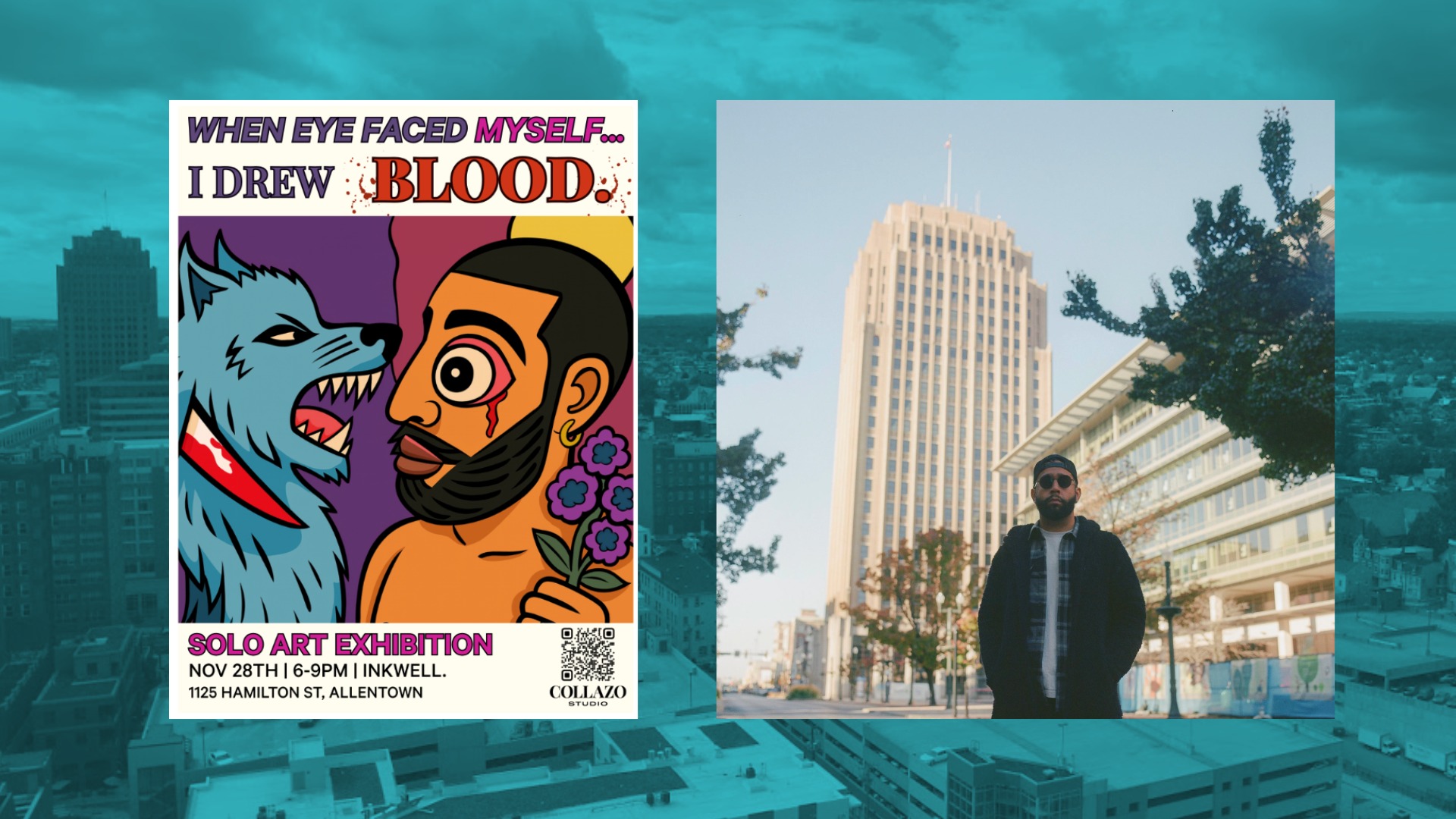 Lehigh Valley artist Dylan Collazo, known for transforming lived experience into symbolic, narrative-driven portraiture, will debut his newest exhibition, When Eye Faced Myself, I Drew Blood, on November 28 at inkwell. in Allentown.