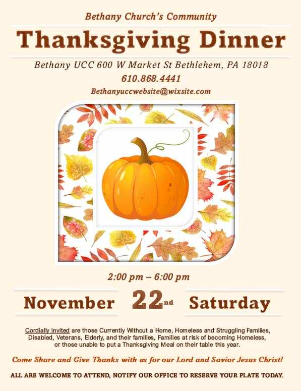 • Free and Open Community Thanksgiving Dinner at Bethany UCC in Bethlehem