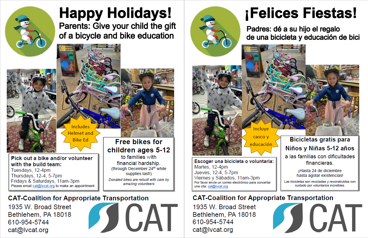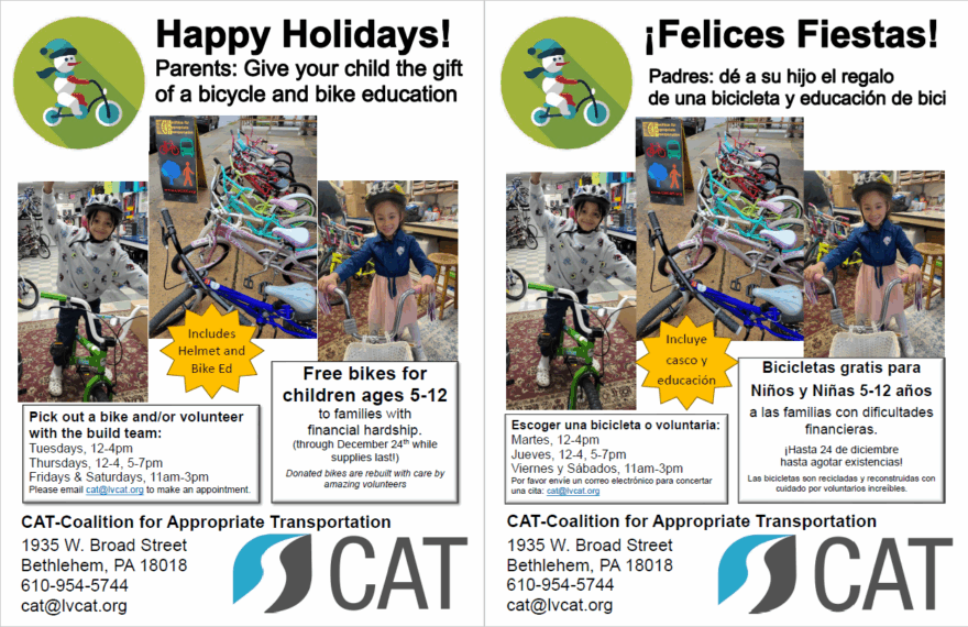 A special bike pickup event will take place on Tuesday, November 18, from 4–7 p.m. at CAT’s current location at 1935 W. Broad Street, Bethlehem, PA. Parents can reserve a bike by emailing cat@lvcat.org with their child’s age and height.