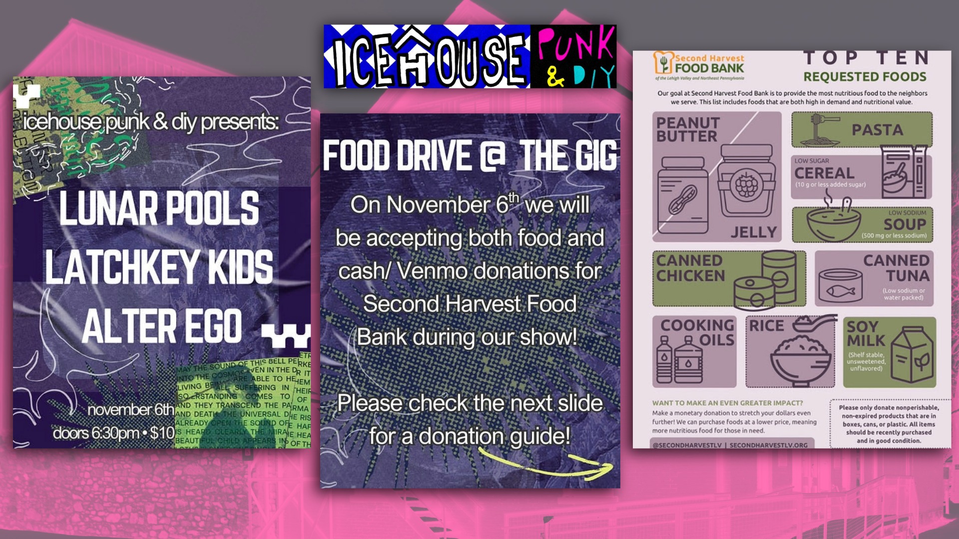 IceHouse Punk & DIY will close out 2025 with a community-focused show on Thursday, November 6, combining live music and a food drive to support Second Harvest Food Bank of the Lehigh Valley and Northeast Pennsylvania.