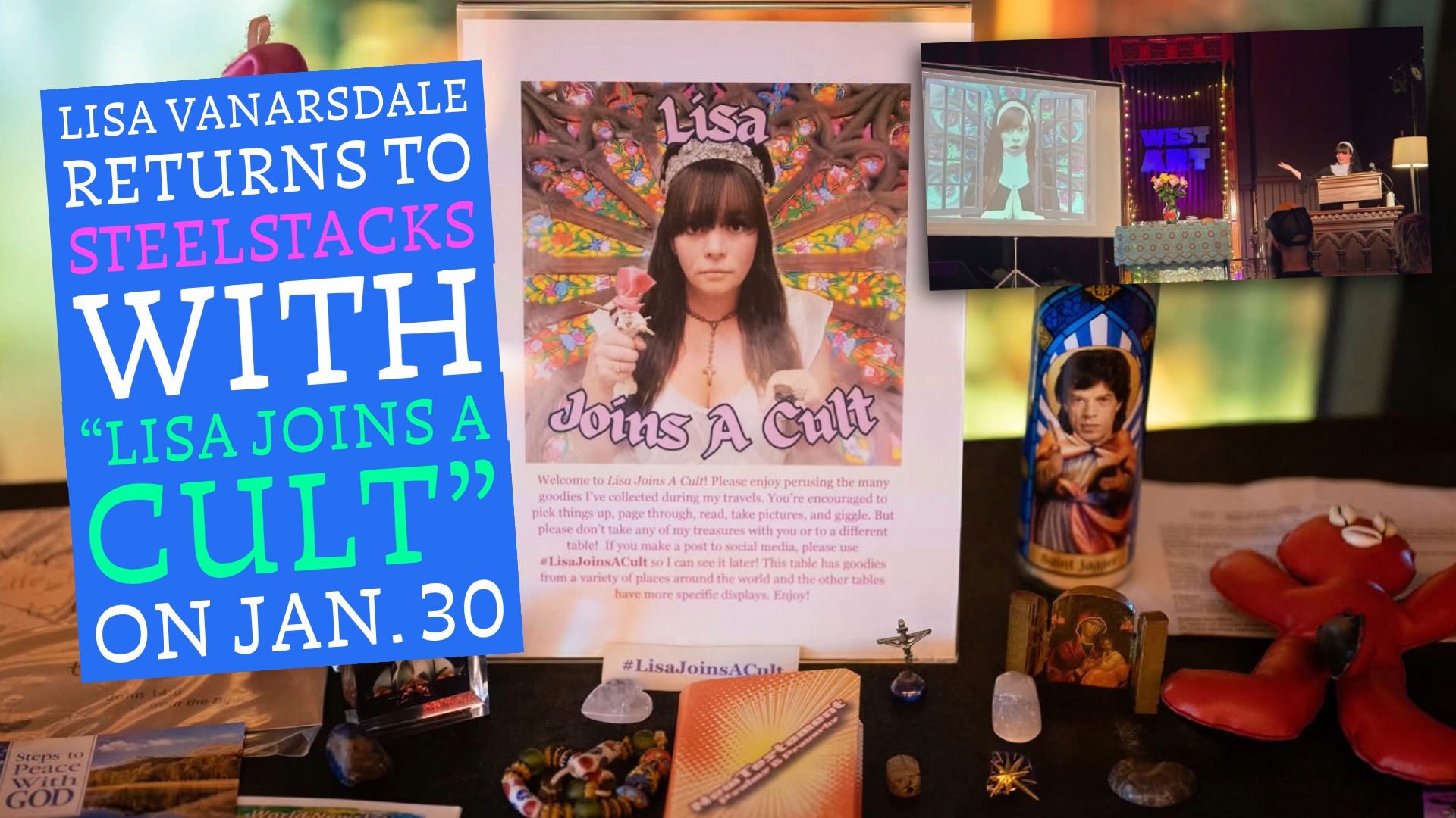 The show blends storytelling, video, and Lisa’s personal collection of literature and artifacts from groups she’s visited over the years, exploring religious “culty” communities with humor and a real effort to keep the focus on the people inside them, not just the spectacle.