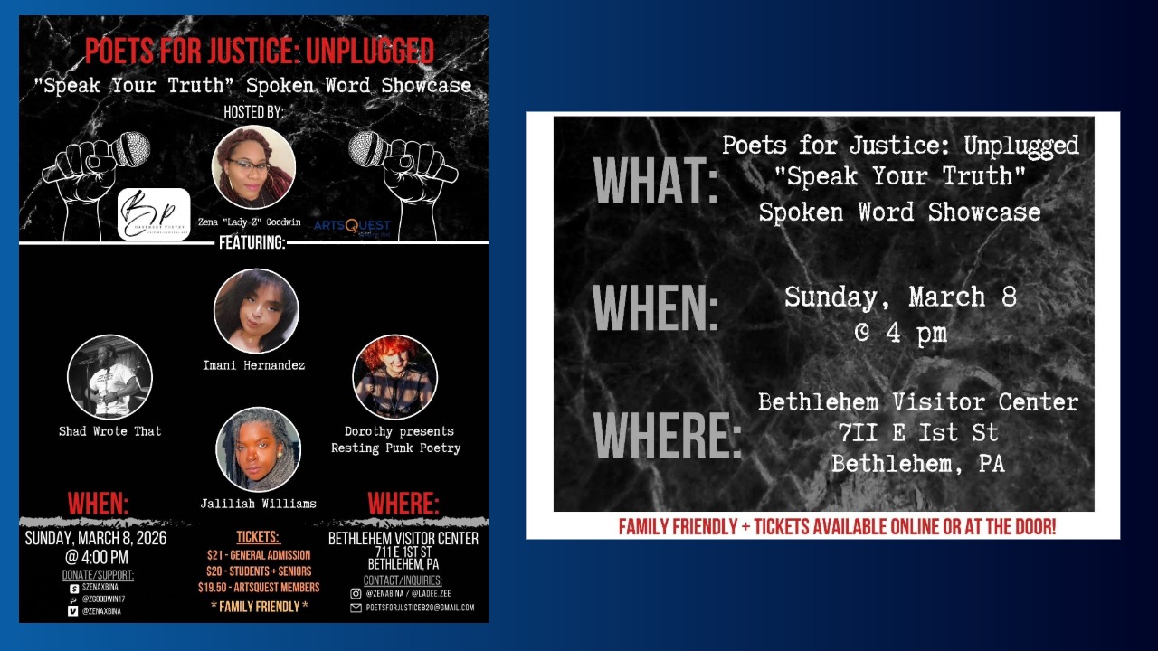 Poets for Justice is bringing its “Unplugged: Speak Your Truth” spoken word showcase to Bethlehem on Sunday, March 8, 2026, at 4:00 p.m. The event will take place at the Bethlehem Visitor Center at SteelStacks in Bethlehem, Pennsylvania.